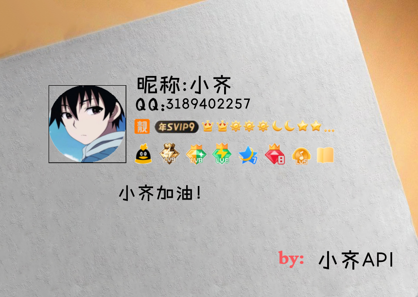请求示例: https://api2.hxvx.xyz/api/qqcard_2.php?qq=3189402257&nick=小齐&name=小齐API&msg=小齐加油!